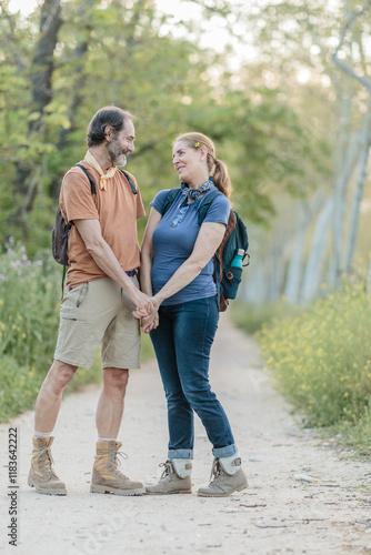 Hikers couple holding hands while hiking in nature in madrid