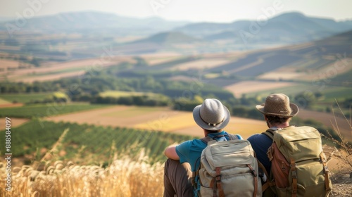 Hikers resting on a hilltop with panoramic views of a patchwork of farmland below, scenic crops, rural exploration
