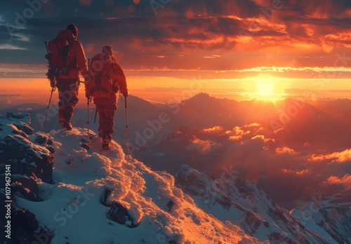 Hikers Supporting Each Other to Reach Mountain Peak at Sunset