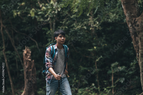 Hikers use trekking pole with backpacks and hold tent bag walking through the forest. hiking and adventure concept.