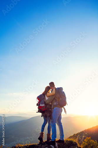 Hikers with backpacks relaxing on top of a mountain and enjoying the view of valley