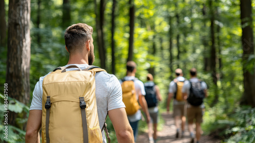 Hikers with backpacks walking on forest trail, enjoying nature and adventure together
