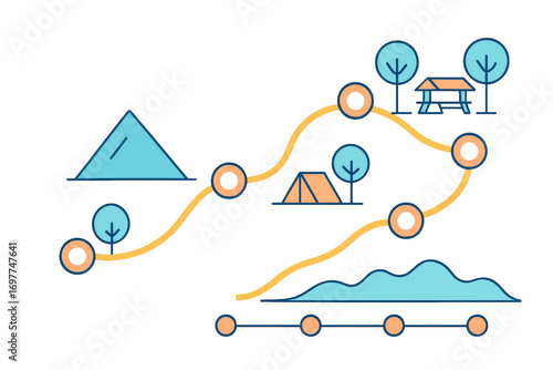 Hiking and camping trail with mountain, trees, tent, and picnic icons in minimalist line art style on white background. Concept of outdoor journey. Ai generative