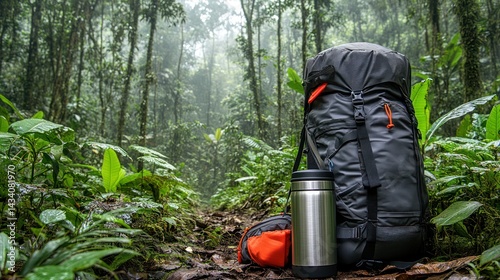 Hiking backpack in a lush, misty rainforest. Packed for an adventure