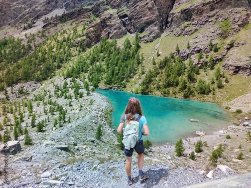 Hiking in the mountains. Blue Lake in Valle d'Aosta, Italy.