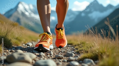 Hiking Trail in Mountains with Runner's Feet Close Up