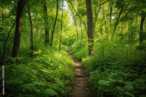hiking trail surrounded by towering trees and lush greenery, created with generative ai