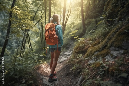 Hiking woman on scenic trails in nature mountain (Ai generated)