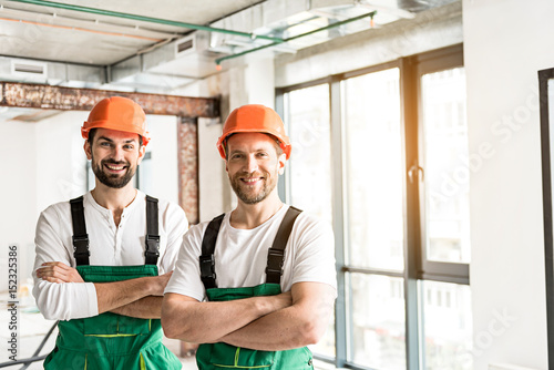 Hilarious smiling constructors folding hands