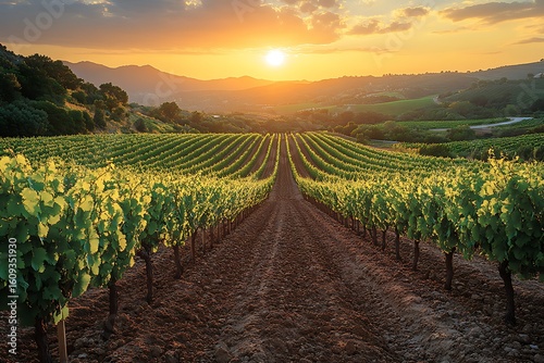 Hillside vineyard illuminated by sunrise rays high resolution picture