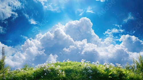 Hilltop flowers, sunny sky, cloudscape, peaceful nature scene; ideal for calm backgrounds