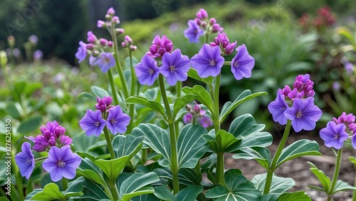 Himalayan Cranesbill Flowers in Bloom Vibrant Violet Petals and Rich Green Leaves in a Spring Botanical Garden Setting