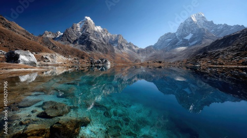 Himalayan Majesty: Crystal clear turquoise lake reflects snow capped mountain peaks under a serene blue sky, encapsulating the breathtaking beauty of the Himalayas.
