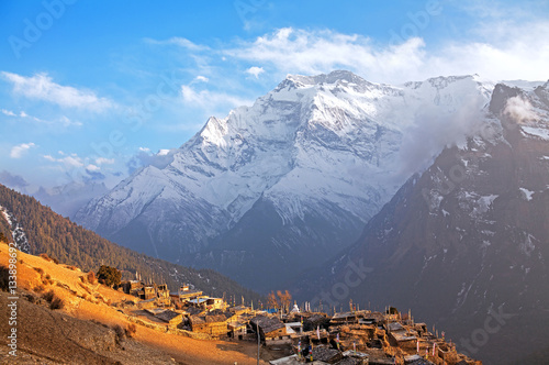 Himalayan village with a Buddhist stupa at sunset. Nepal, Himalayas.