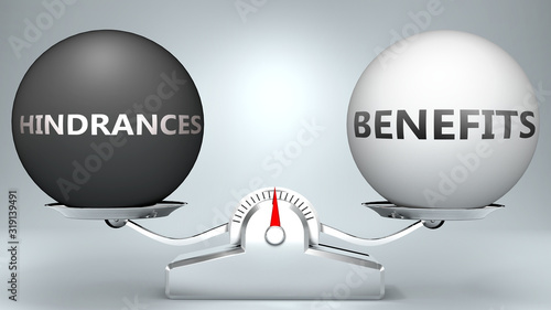 Hindrances and benefits in balance - pictured as a scale and words Hindrances, benefits - to symbolize desired harmony between Hindrances and benefits in life, 3d illustration