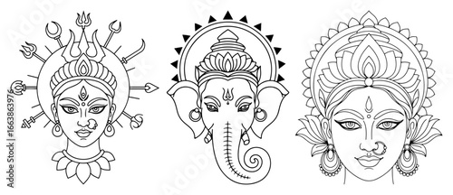 Hindu deities Ganesha Durga and Lakshmi face icons vector set