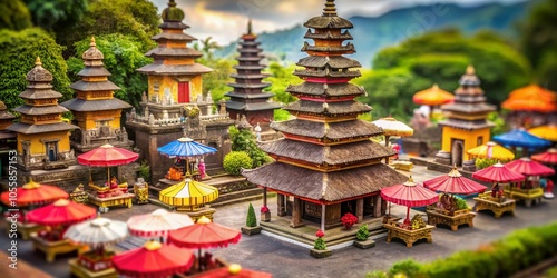 Hindu Temple in Bali with Offerings, Red Poleng Cloth, and Balinese Umbrellas - Tilt-Shift Photography