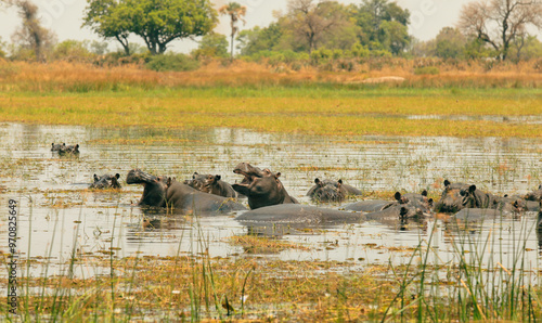Hippos lounging in a tranquil Botswana national park wetland during midday under clear skies