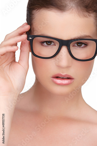 Hipster Beauty. Studio portrait of a beautiful woman wearing thick rimmed glasses isolated on white.