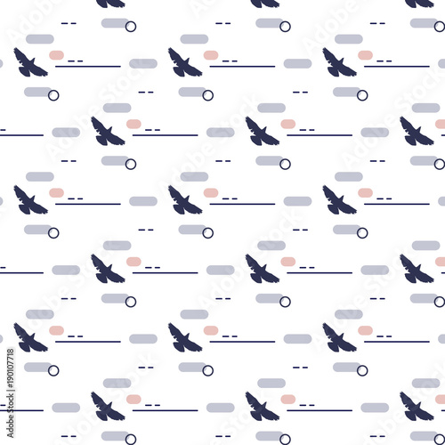Hipster fashion memphis pattern ornament with lilac bird and blue cross and lilac line and pink drop on white background