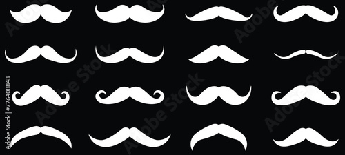 Hipster mustache icon set. Different flat vector collection isolated on transparent background. Black silhouette of adult man Italian moustache. Symbol of Fathers day.old facial hair styles.