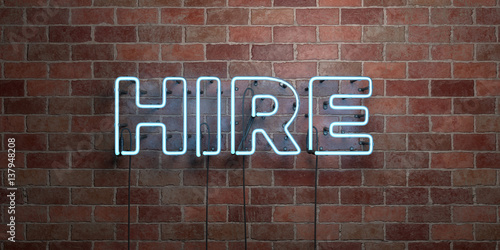 HIRE - fluorescent Neon tube Sign on brickwork - Front view - 3D rendered royalty free stock picture. Can be used for online banner ads and direct mailers..