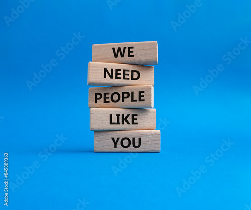 Hiring symbol. Wooden blocks with words We need People like You. Beautiful blue background. Business and Hiring concept. Copy space.