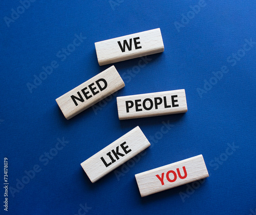 Hiring symbol. Wooden blocks with words We need People like You. Beautiful deep blue background. Business and Hiring concept. Copy space.