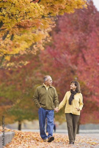 Hispanic couple holding hands outdoors in autumn