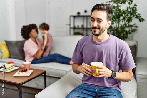 Hispanic father of interracial family drinking a cup coffee winking looking at the camera with sexy expression, cheerful and happy face.
