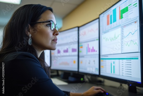 Hispanic Female Senior Data Scientist Reviewing Risk Management Reports on Digital Screen in Monitoring Room.