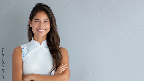 Hispanic female smile in traditional culture dress cheongsam, ethnicity