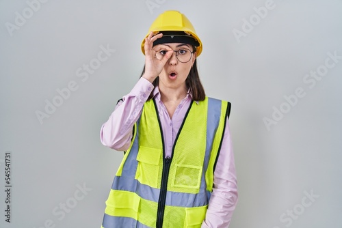 Hispanic girl wearing builder uniform and hardhat doing ok gesture shocked with surprised face, eye looking through fingers. unbelieving expression.