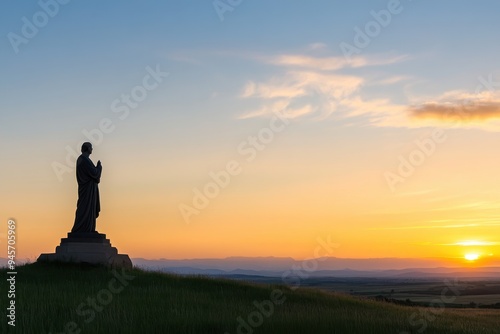 Hispanic Heritage Monument: A photograph of a monument or statue commemorating Hispanic contributions to society, set against a sunset backdrop.