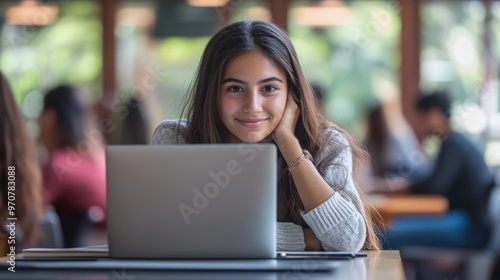 Hispanic latin girl college student using laptop computer watching distance online learning seminar class remote university webinar or having virtual classroom meeting in university creative space.