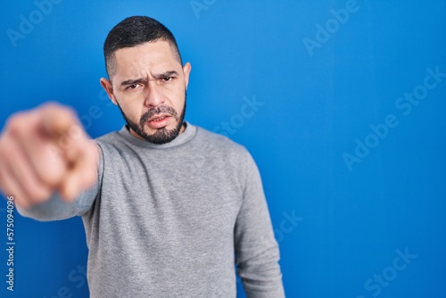 Hispanic man standing over blue background pointing displeased and frustrated to the camera, angry and furious with you