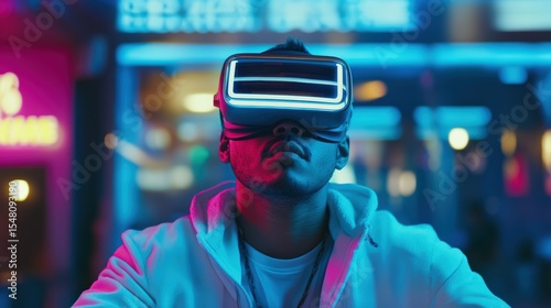 Hispanic man wearing VR headset fully immersed in virtual world with glowing futuristic landscapes showcasing virtual reality gaming technology and digital entertainment experience