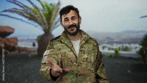 Hispanic man with beard in military uniform stands outdoors in a park with lush greenery and trees.
