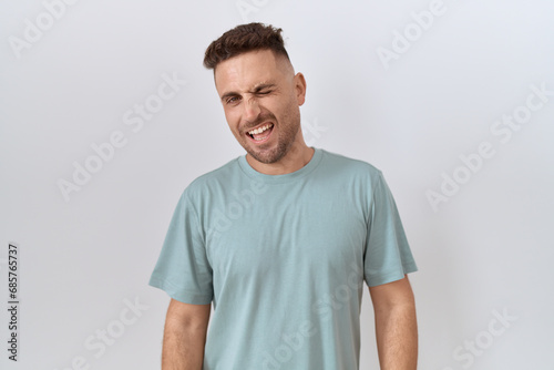 Hispanic man with beard standing over white background winking looking at the camera with sexy expression, cheerful and happy face.