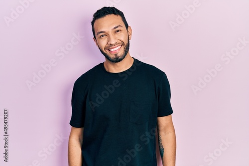 Hispanic man with beard wearing casual black t shirt with a happy and cool smile on face. lucky person.