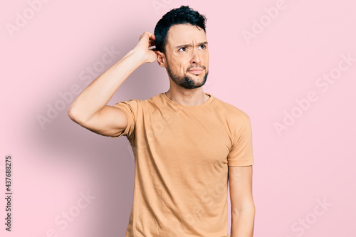 Hispanic man with beard wearing casual t shirt confuse and wondering about question. uncertain with doubt, thinking with hand on head. pensive concept.