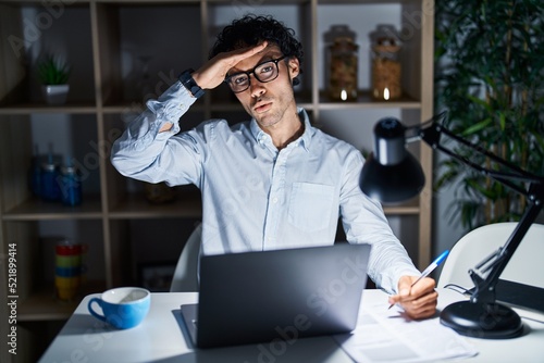 Hispanic man working at the office at night worried and stressed about a problem with hand on forehead, nervous and anxious for crisis
