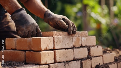 Hispanic mason laying bricks for a garden wall. Featuring masonry and outdoor construction