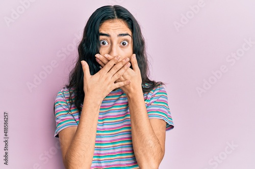 Hispanic teenager girl with dental braces wearing casual clothes shocked covering mouth with hands for mistake. secret concept.