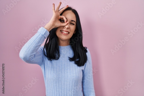 Hispanic woman standing over pink background doing ok gesture with hand smiling, eye looking through fingers with happy face.