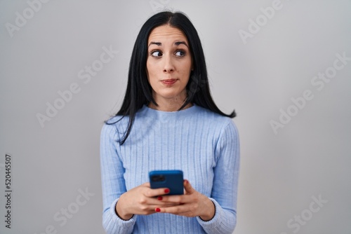 Hispanic woman using smartphone smiling looking to the side and staring away thinking.