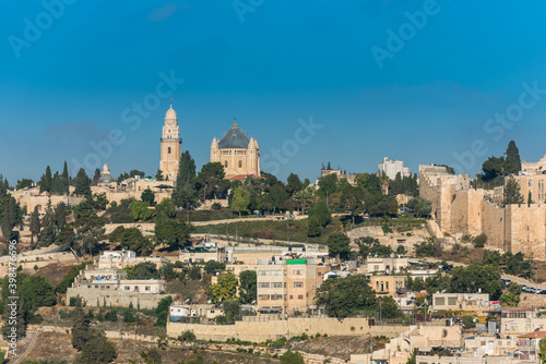 Historic buildings and Abbey of the Dormition , an abbey and the name of a Benedictine community in Jerusalem on Mount Zion, View from Mount of Olives.