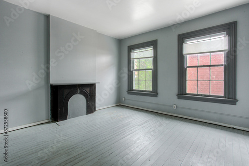 Historic Empty Room With Two Large Windows And A Black Fireplace, With Gray Walls And Floor
