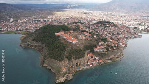 Historic Samuel's fortress overlooks serene coastal town with modern architecture under cloudy sky, Ohrid