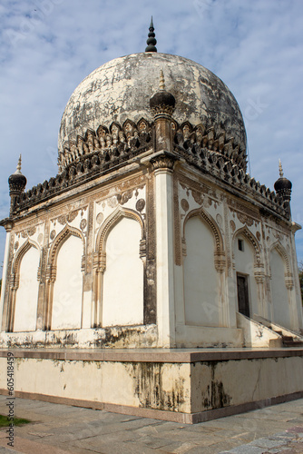 Historic tomb building with landscaped garden in Qutb Shahi Archaeological Park, Hyderabad, India